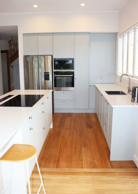 Character and light were an important part of the brief and this was achieved in the design by specifying the beautiful Villa Blue Dezignatek Rhonda Profile Doors along the L shaped walls of tall wall cabinetry and below the sink window. A modern island featuring flat panelled profile doors in a warm white completes the layout and maximise the length of the room to enable casual seating over the stunning sea views over the bay window.